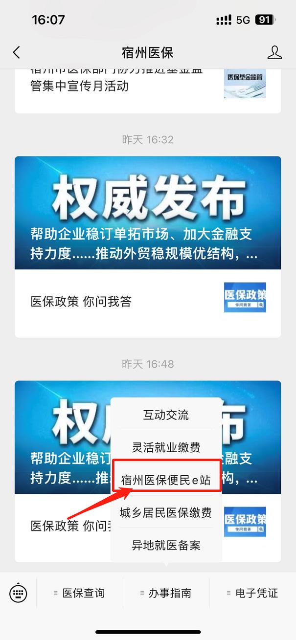 第一步:关注“宿州医保”微信公众号,选择下方【办事指南】后,点击“宿州医保便民e站”,进入医保业务办理界面。