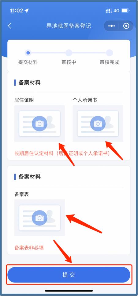 2.按界面显示所需的材料清单,上传电子材料(手机等拍照的jpg格式照片即可),填写完成并核对无误后,点击【提交】,完成备案。