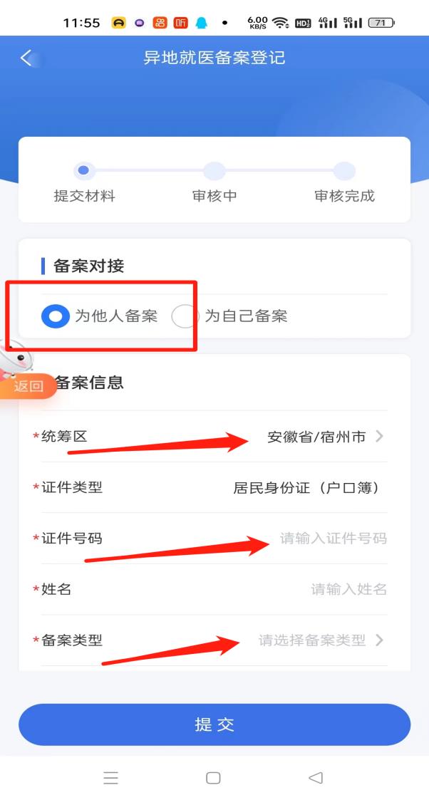 在界面上勾选【为他人备案】,选择“他人”就医人所在的【统筹区】、【证件类型】,输入就医人的证件号码,系统自动查询就医人的参保信息,选择备案类型、就医地、开始日期,填写联系人电话、联系人地址等信息,按界面显示所需的材料清单,上传电子材料(手机等拍照jpg格式即可),填写完成并核对无误后,点击【提交】,完成备案