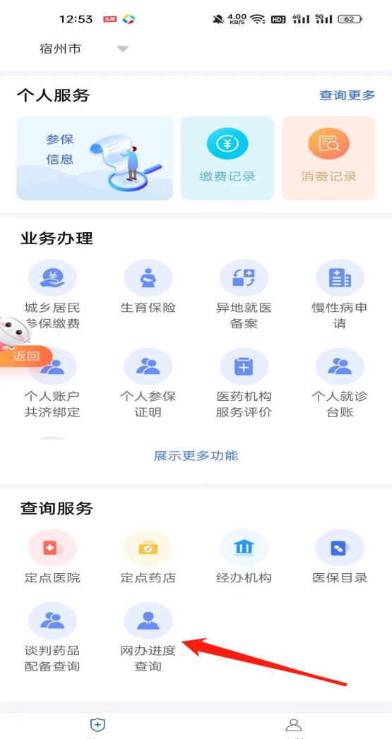 打开医保业务办理界面,点击“网办进度查询”。在“网办进度查询”界面,可以查询到通过线上办理异地就医备案业务的进度情况。